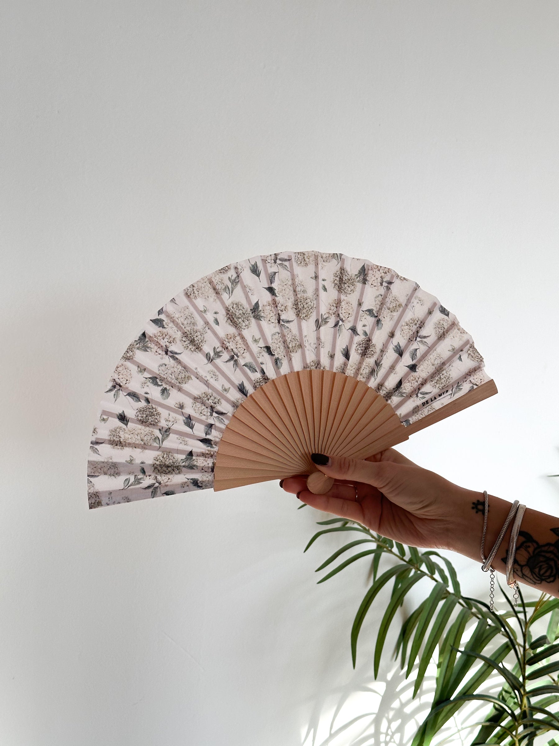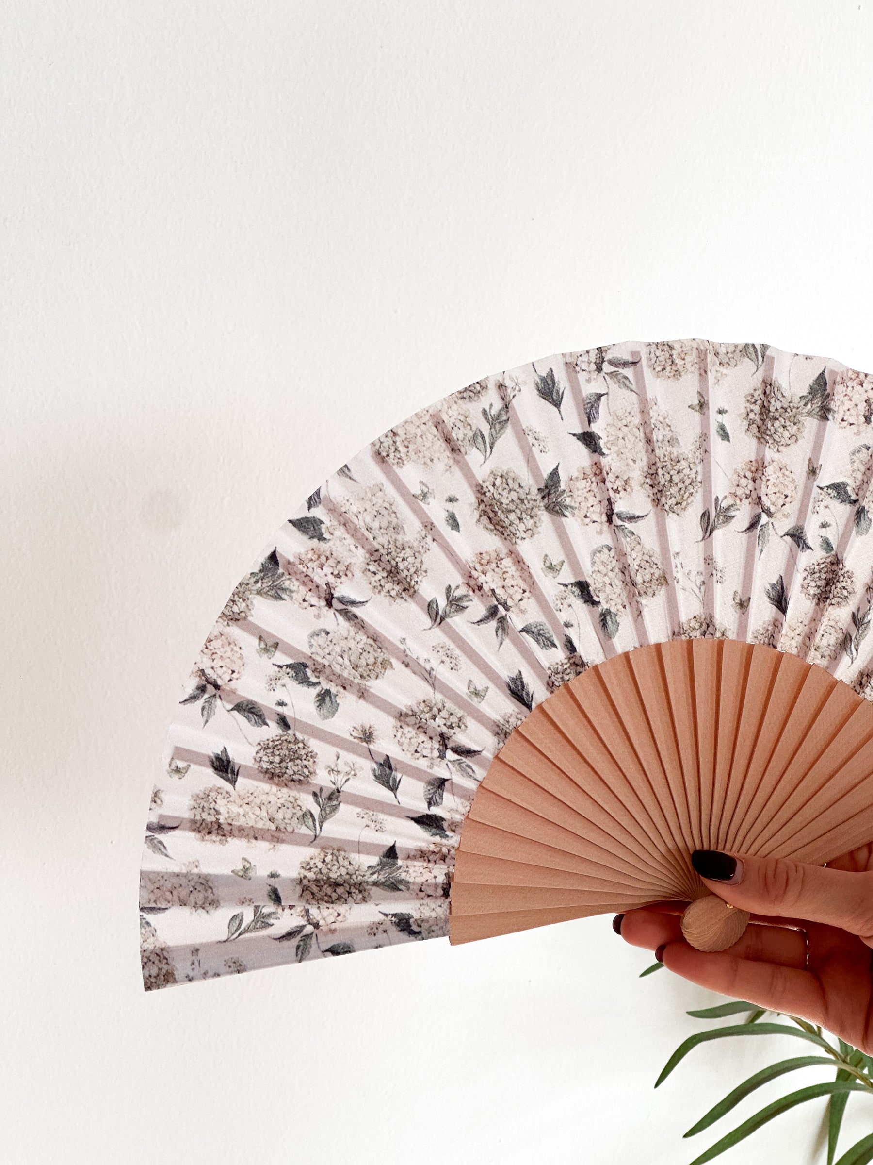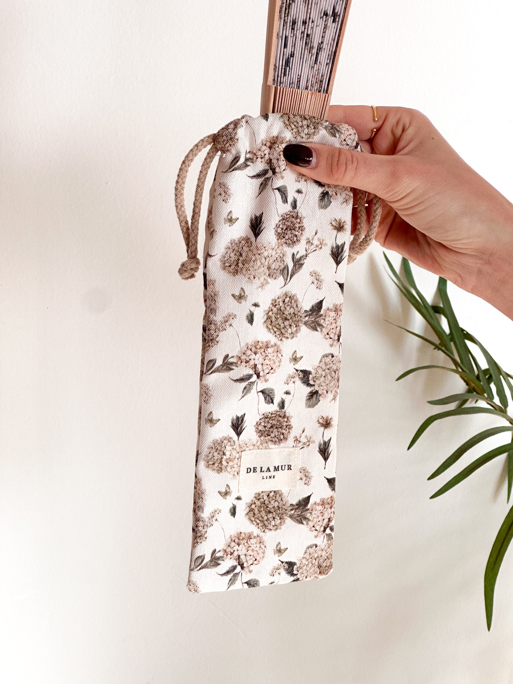 Abanico con funda a conjunto. Abanico con tela estampada 100% poliéster con tacto seda y madera natural pulida. Funda con tejido fino de half-panama con estampado de hortensias en tonos beige, con cordón ajustable en los laterales. Para su correcto mantenimiento se aconseja lavar la funda en frío y no utilizar secadora.