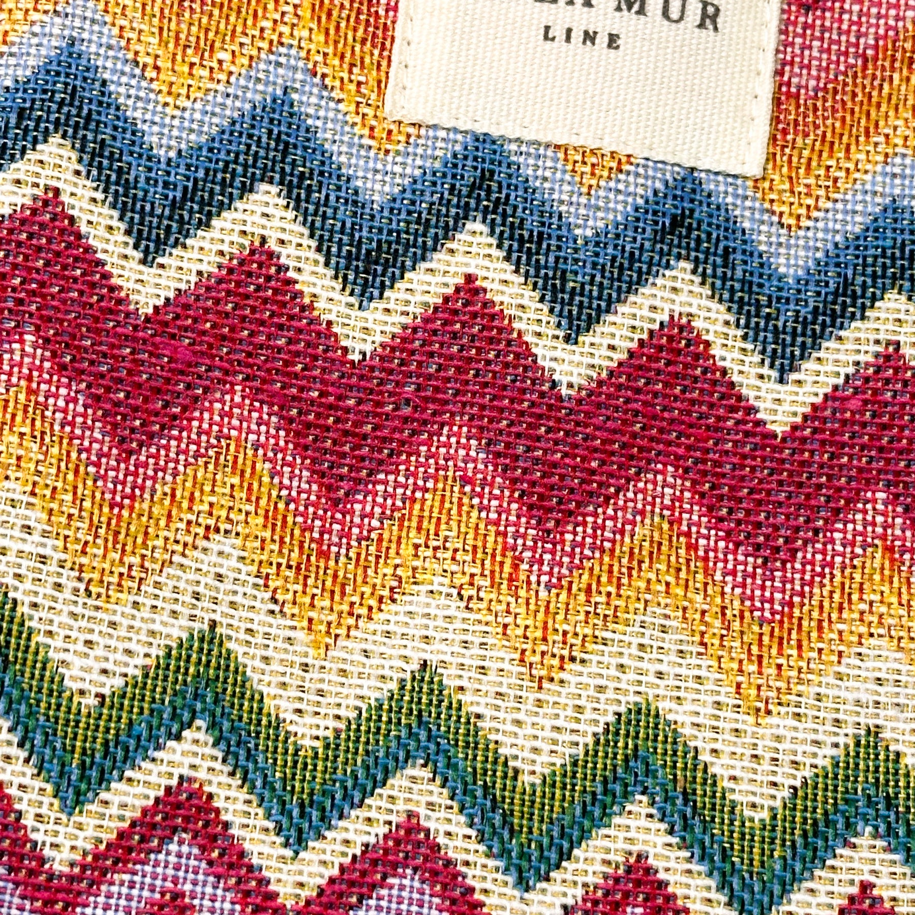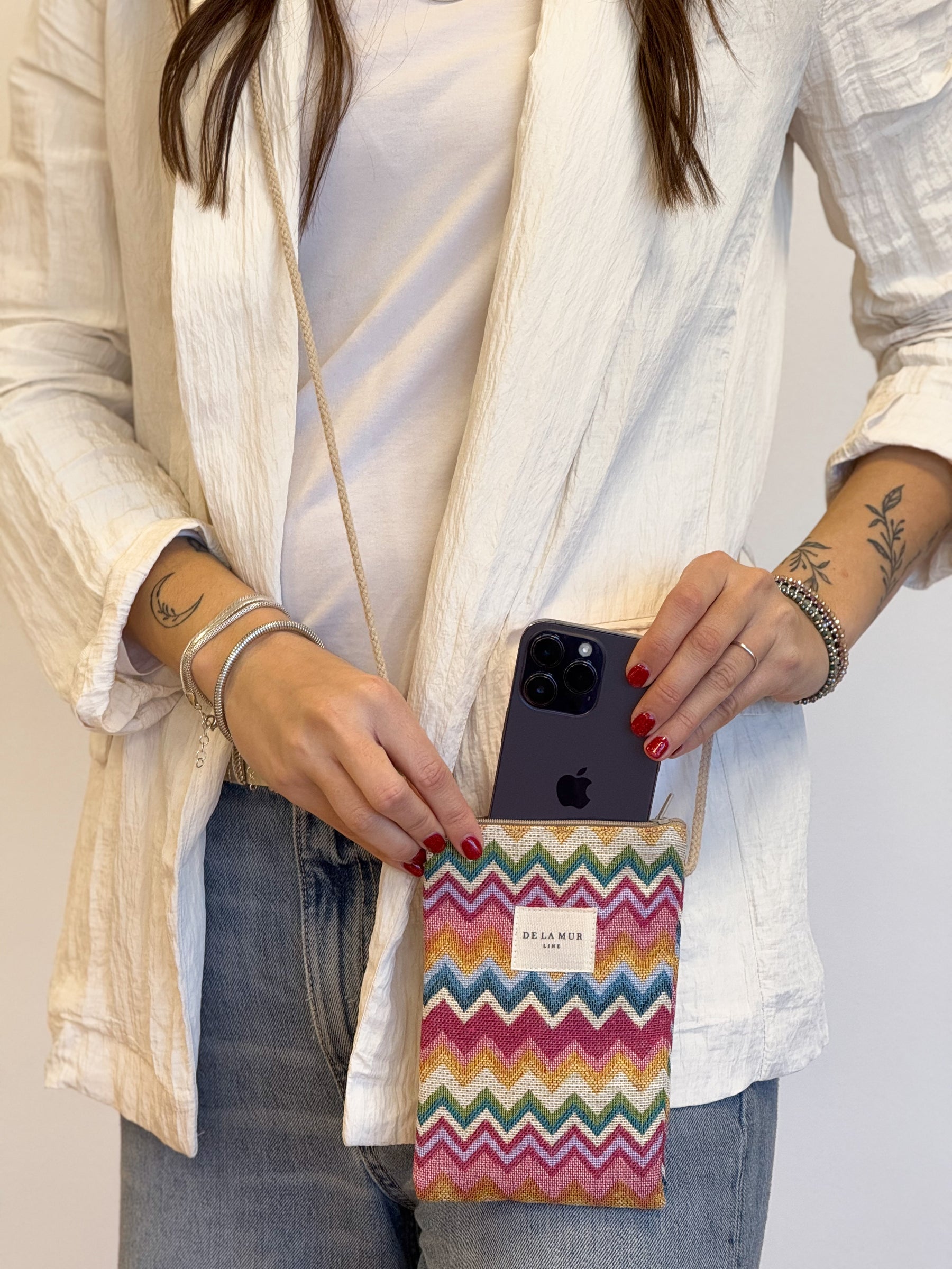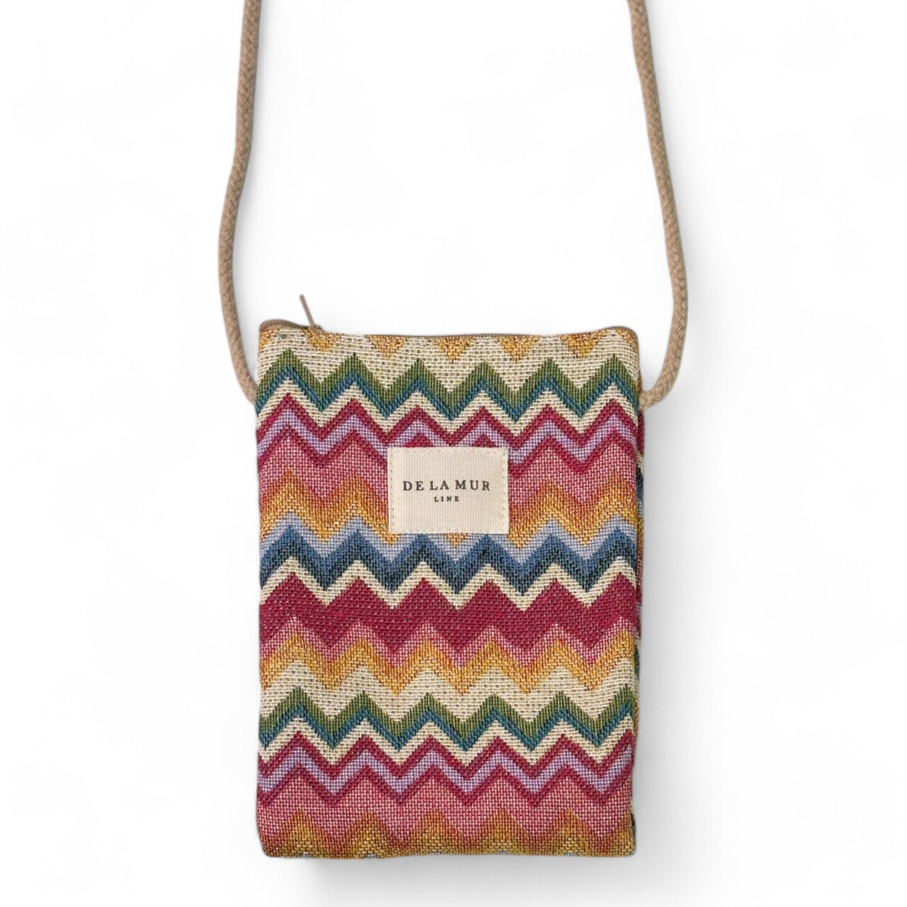 Bolsito porta móvil para llevar tipo bandolera. Con cremallera en la parte superior y cordón largo de algodón de color beige. Con tejido grueso de jacquard con estampado zigzag en tonos rosados y azulados. Cada articulo puede tener una variación en el estampado, dependiendo de donde se haya efectuado el corte de la pieza. Forrado de tejido grueso de color gris en la parte interior. Para su correcto mantenimiento se aconseja lavarlo en frío a mano y no utilizar secadora.