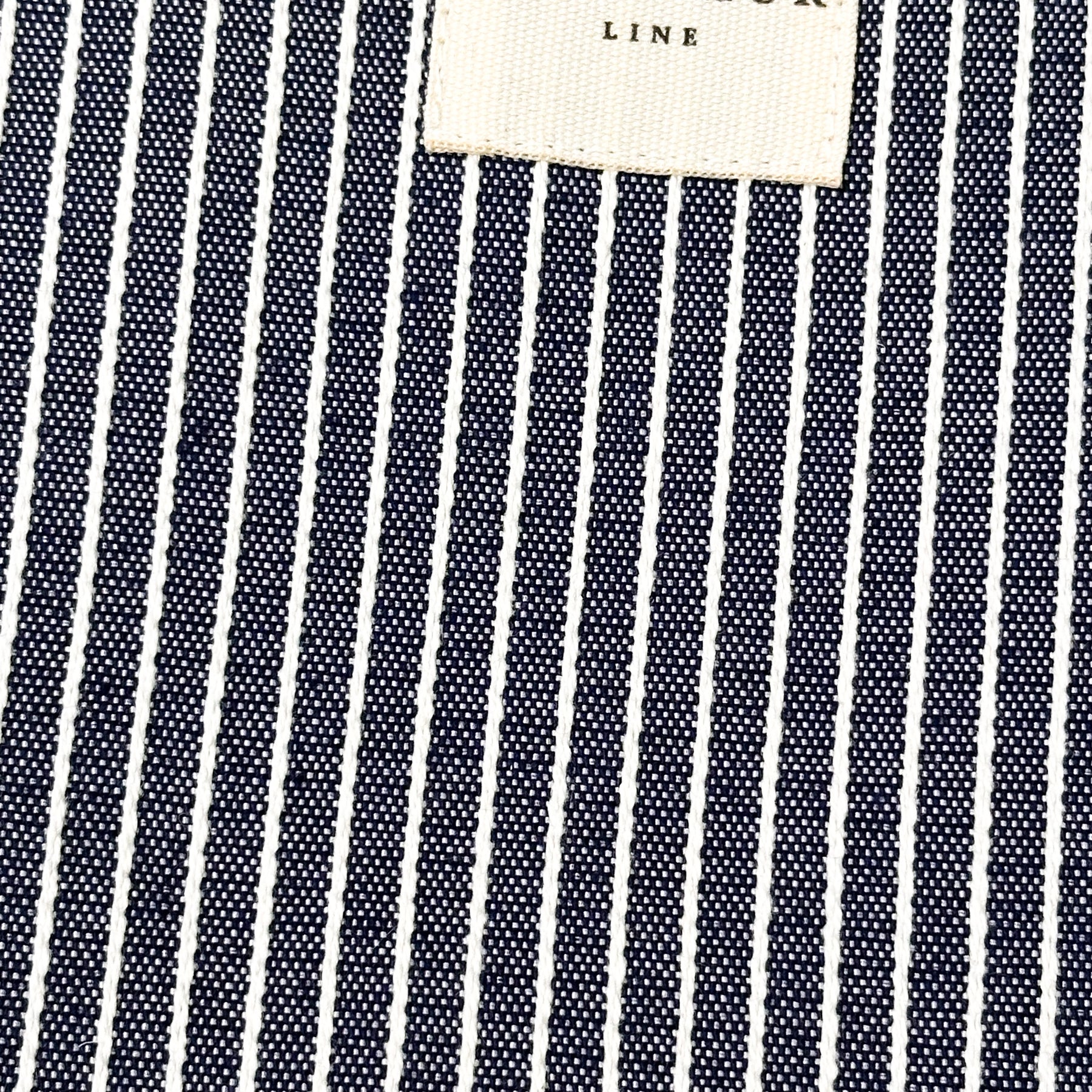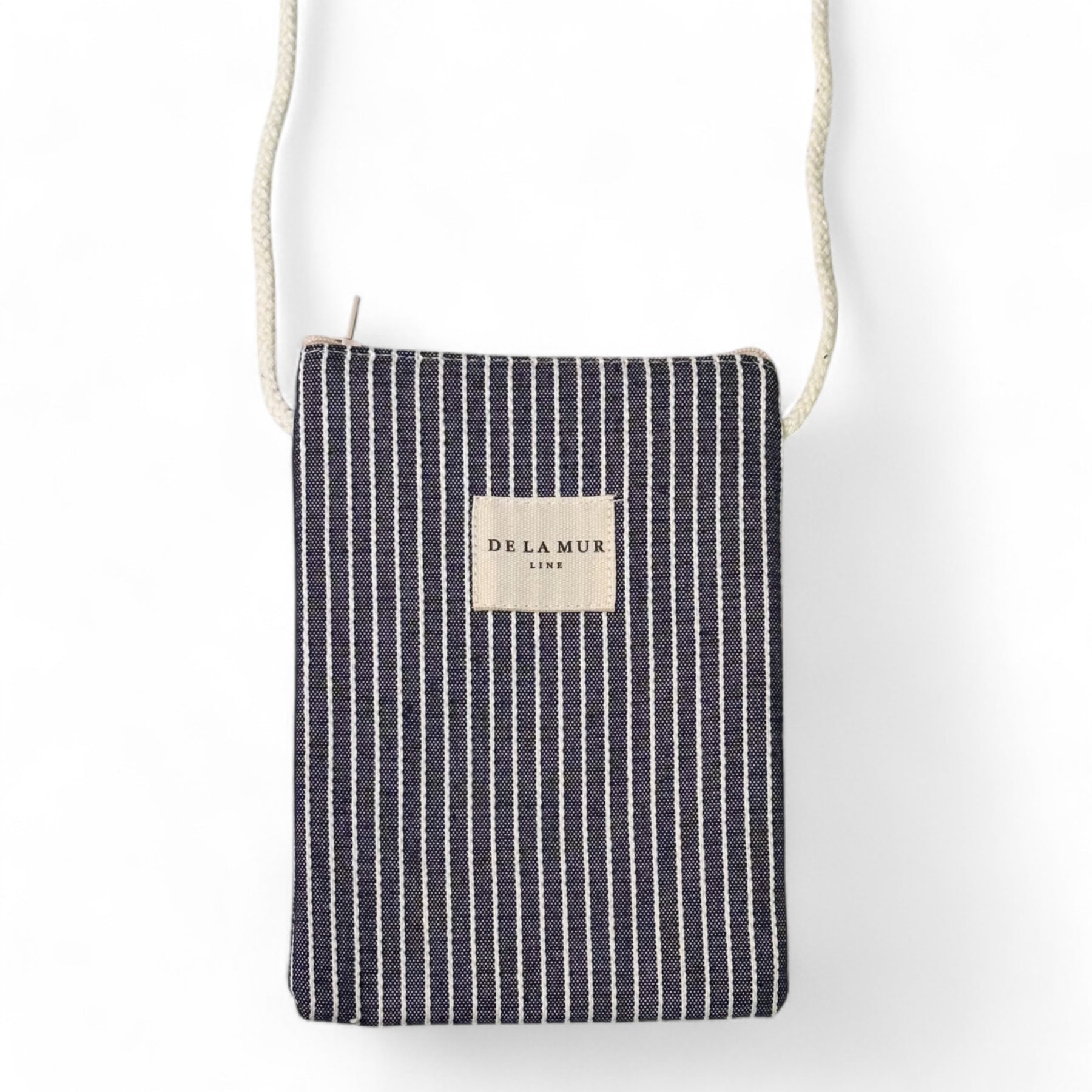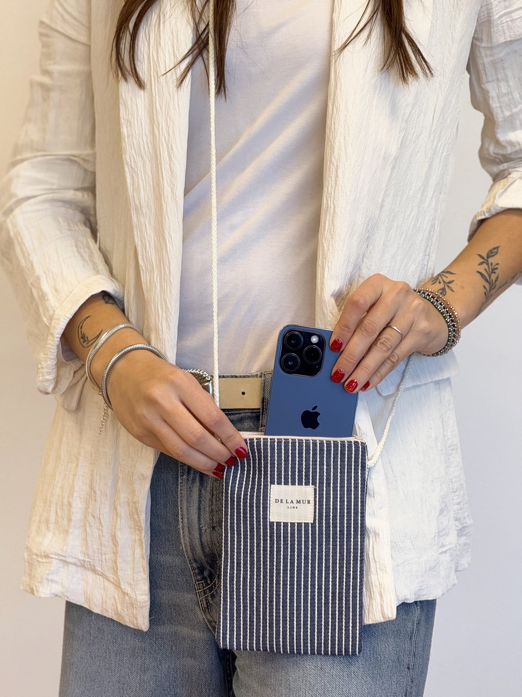 Bolsito porta móvil para llevar tipo bandolera. Con cremallera en la parte superior y cordón largo de algodón de color crudo. Con tejido fino con estampado a rayas de color crudo sobre fondo azul marino. Cada articulo puede tener una variación en el estampado, dependiendo de donde se haya efectuado el corte de la pieza. Forrado de tejido grueso de color gris en la parte interior. Para su correcto mantenimiento se aconseja lavarlo en frío a mano y no utilizar secadora.