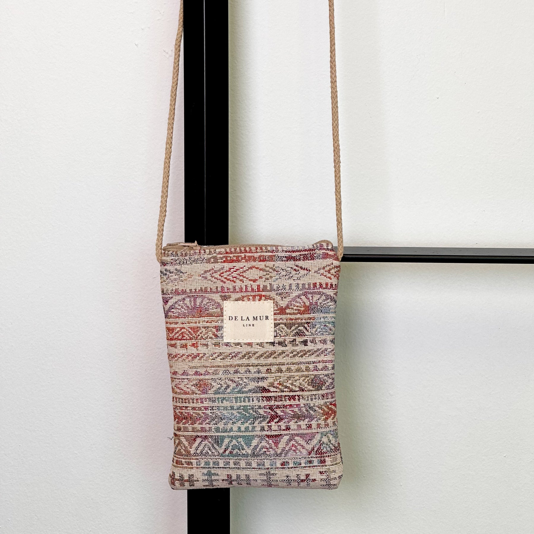 Bolsito porta móvil para llevar tipo bandolera, con cremallera en la parte superior y cordón largo de algodón de color beige. Con tejido con estampado étnico multicolor. Cada articulo puede tener una variación en el estampado, dependiendo de donde se haya efectuado el corte de la pieza. Forrado de tejido grueso de color gris en la parte interior. Para su correcto mantenimiento se aconseja lavarlo en frío a mano y no utilizar secadora.