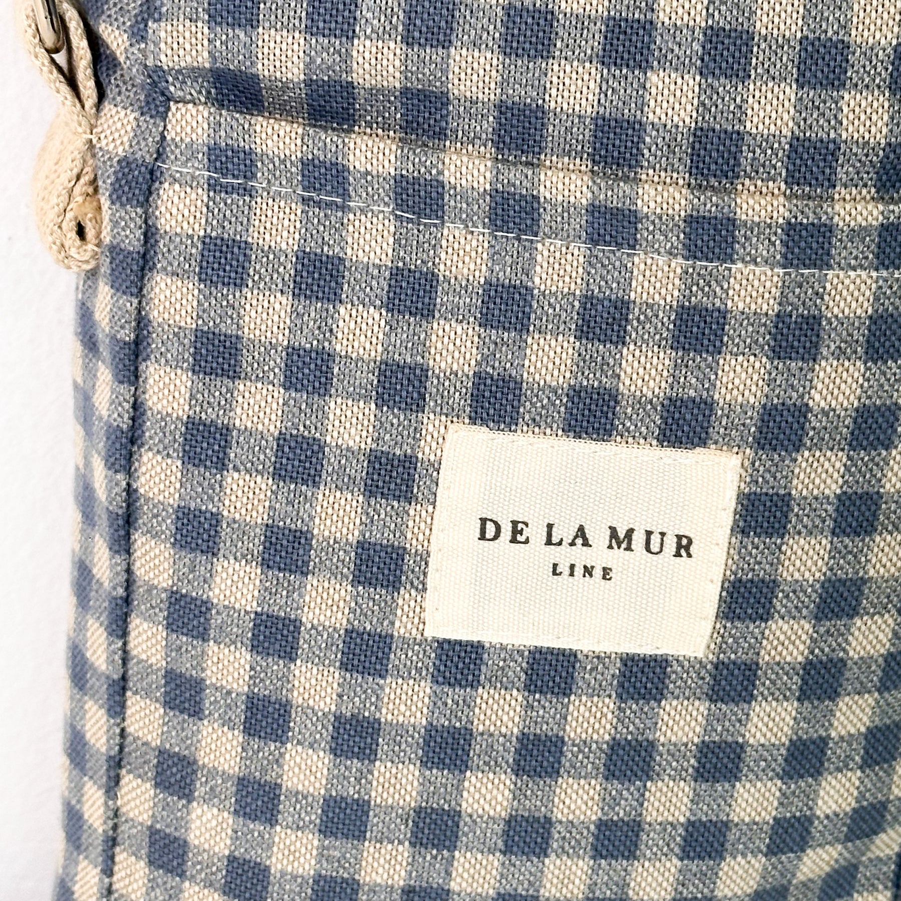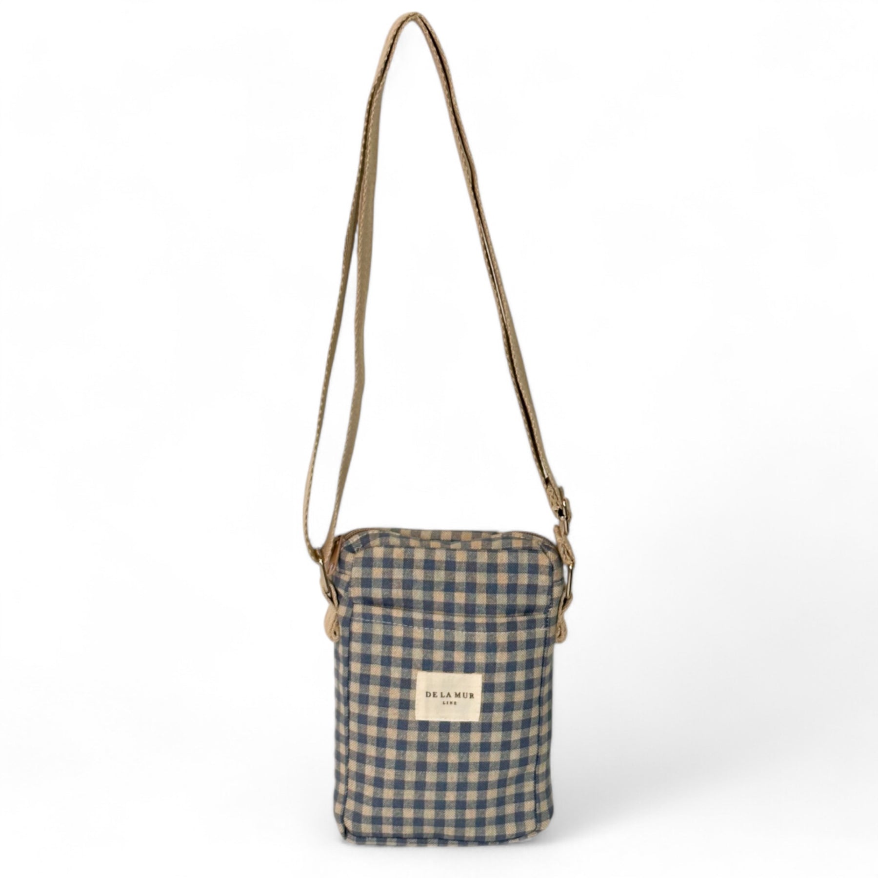 Bolso porta móvil para llevar tipo bandolera, con cremallera en la parte superior y asa larga ajustable de cinta de espiga de algodón de color beige. Bolsillo sin cremallera en la parte exterior. Con tejido fino de half-panama con estampado a cuadros vichy de color azul. Forrado de tejido grueso de color gris en la parte interior. Para su correcto mantenimiento se aconseja lavarlo en frío a mano y no utilizar secadora.