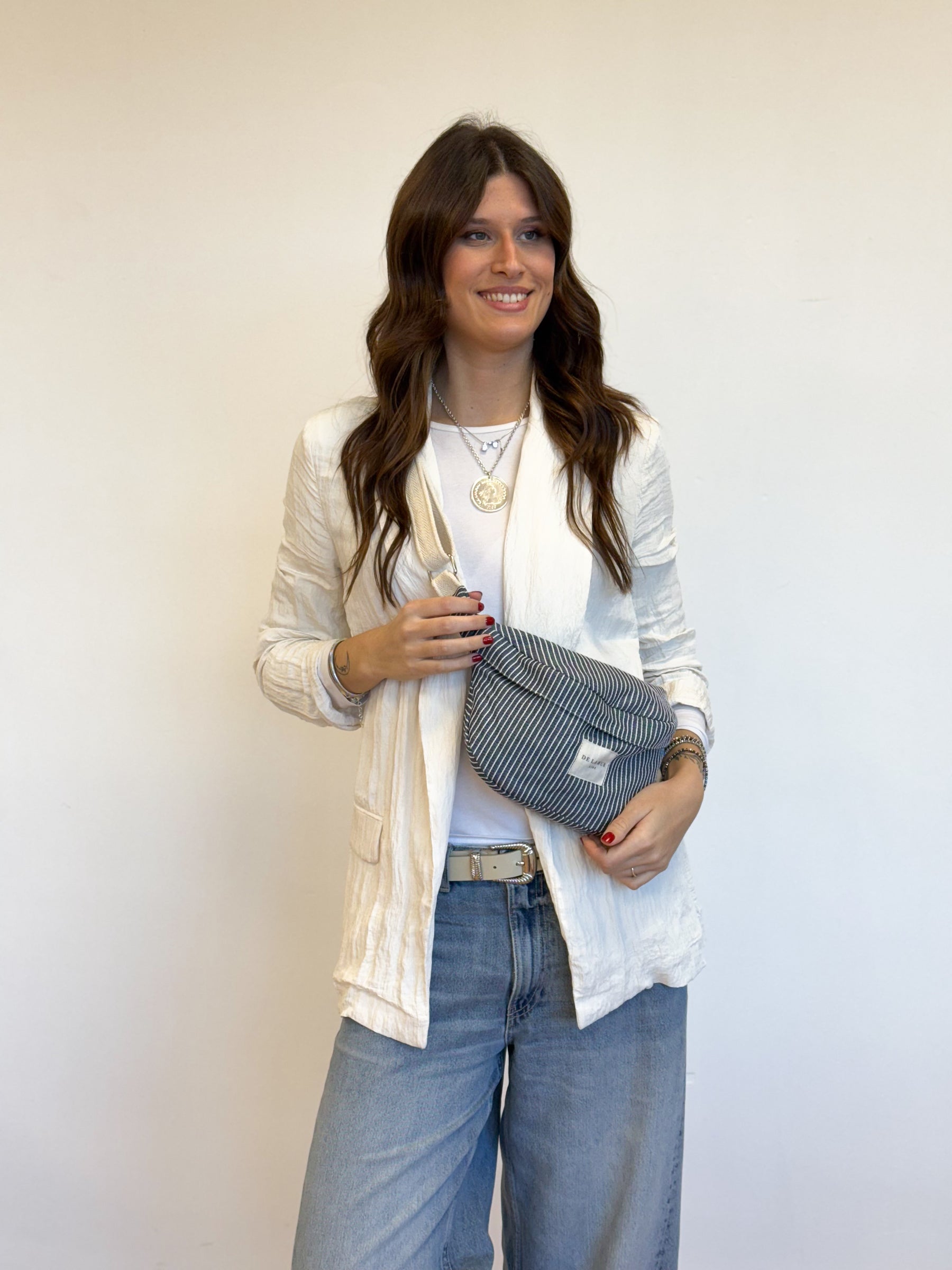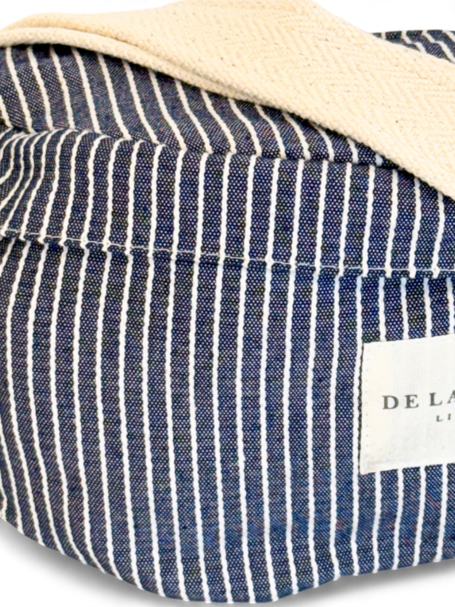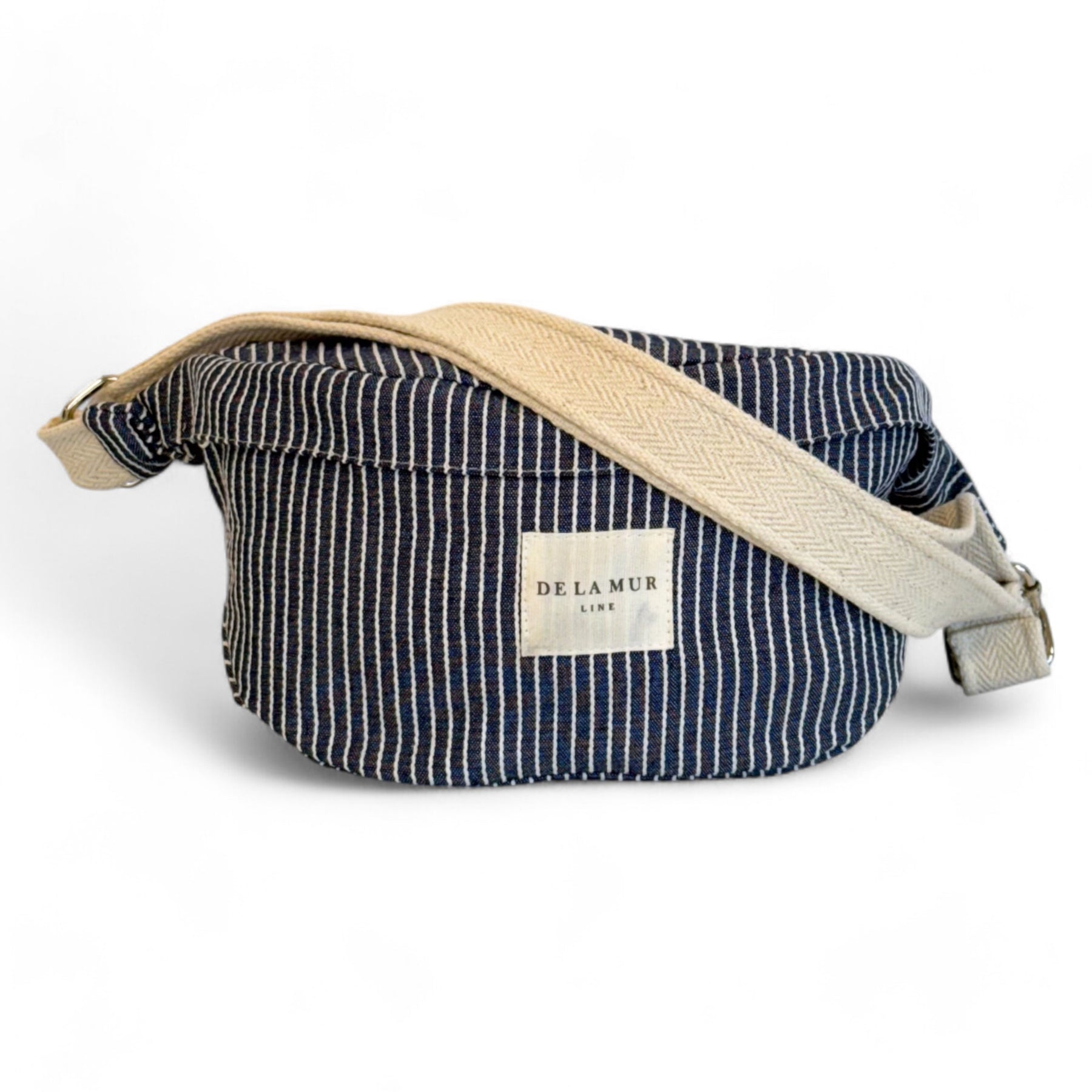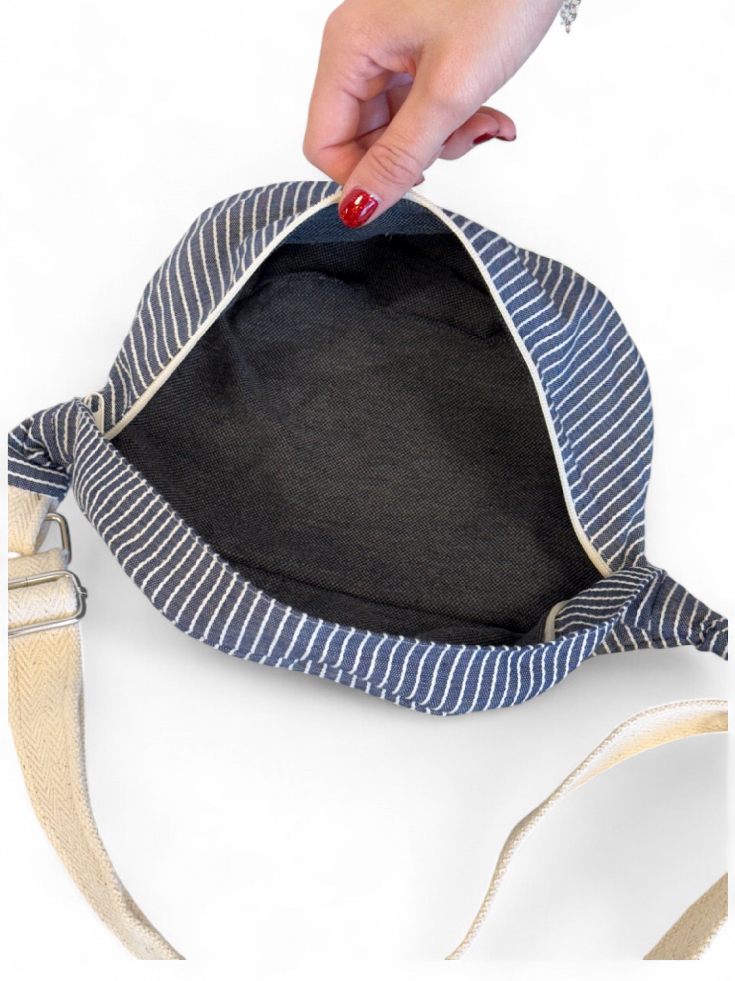 Bolso riñonera tipo bandolera con asa larga ajustable de cinta de espiga de algodón de color crudo. Con un tejido fino a rayas de color crudo sobre fondo azul marino. Cierre superior con cremallera. Forrado de tejido grueso de color gris en la parte interior. Para su correcto mantenimiento se aconseja lavarlo en frío a mano y no utilizar secadora.